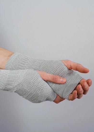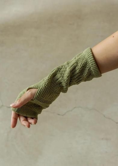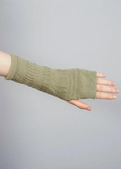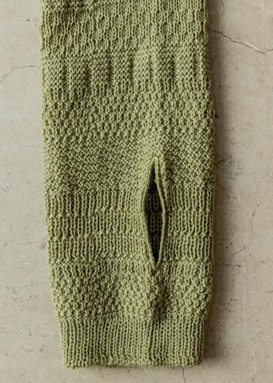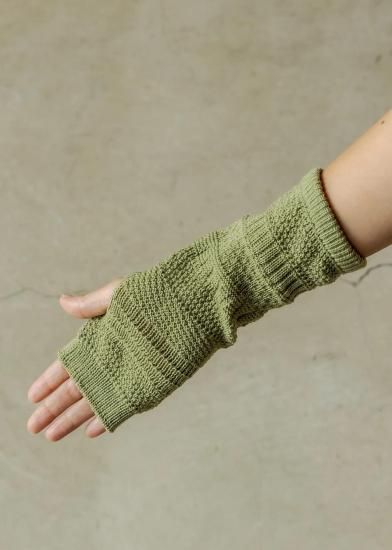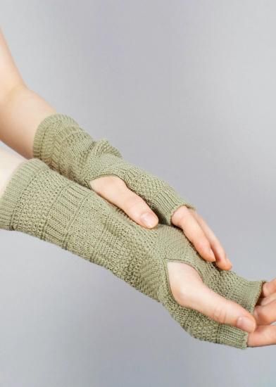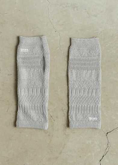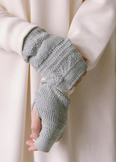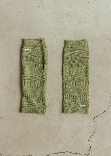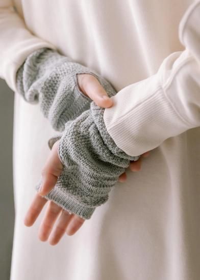 ニットを試作した際のテストピース(20cmくらいの筒状のニット)から着想を得たアイテム。試作柄は製品化されることなく、捨てられてしまうもの。それを再利用する方法はないかと、ハンドウォーマーのデザインに転用しました。手袋の上からはめることができるよう、少しゆったりとした作りに仕上げています。指先が出るので、登山中、撮り逃したくない瞬間にすぐスマホを操作できる。街で付けても可愛い編み柄です。